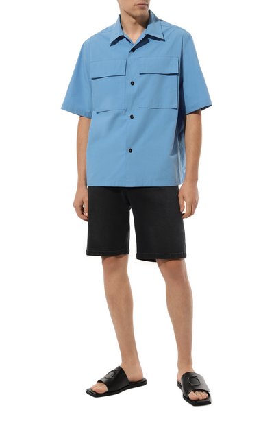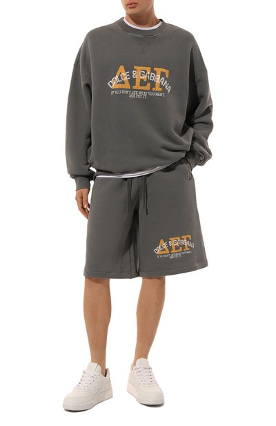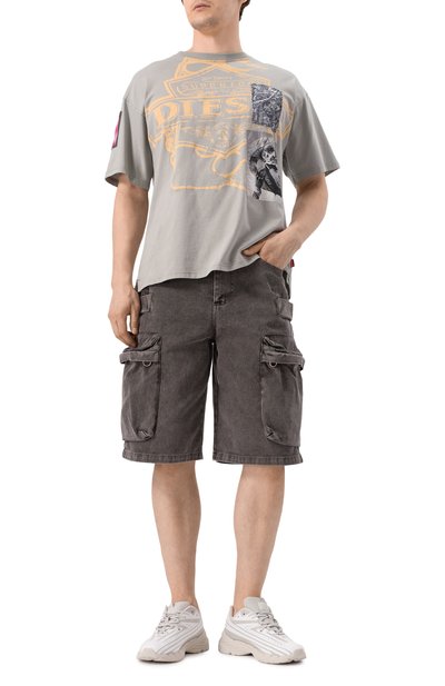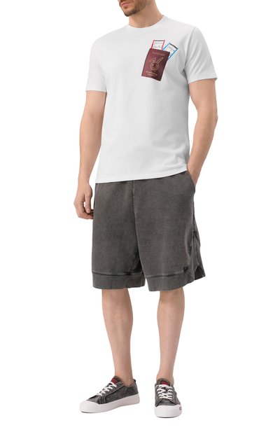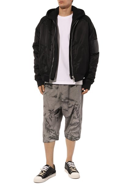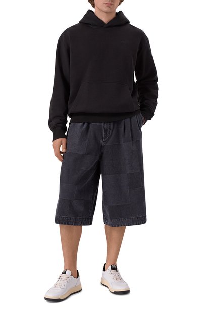 Шорты свободного кроя сшили из выбеленного хлопкового трикотажа. Модель со средней посадкой, широким поясом-кулиской и тремя карманами украсили контрастной эмблемой марки.