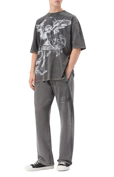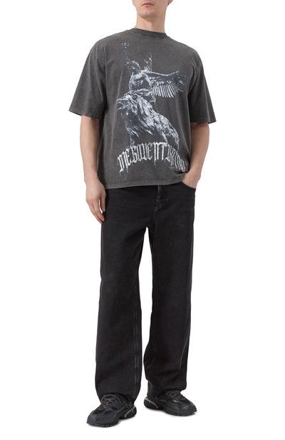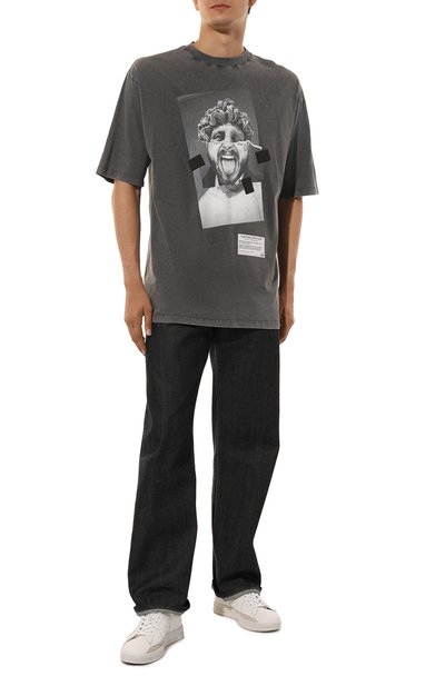 Для пошива футболки с круглым вырезом и спущенной линией плеч использовали хлопковое джерси. Модель свободного кроя украсили спереди крупным принтом с логотипом марки.
