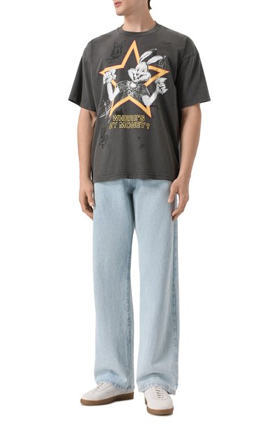 Для пошива футболки с круглым вырезом и спущенной линией плеч использов али хлопковое джерси. Модель свободного кроя украсили спереди крупным принтом с логотипом марки.
