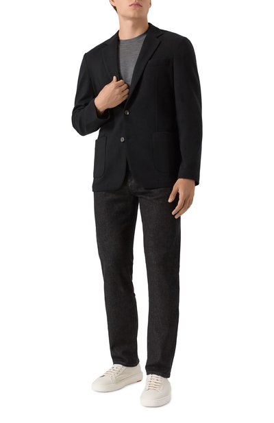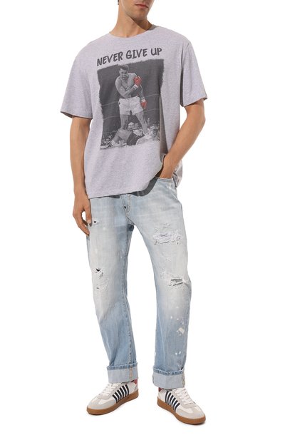 Футболку с круглым вырезом и спущенной линией плеч сшили из хлопкового джерси. Эластичную модель свободного кроя украсили крупной надписью и логотипом марки.