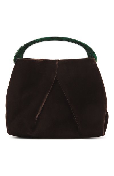 Драпированную сумку со съемным плечевым ремнем и внутренним карманом на молнии сшили из бархата. Аксессуар с магнитным замком дополнили ручкой из смолы.