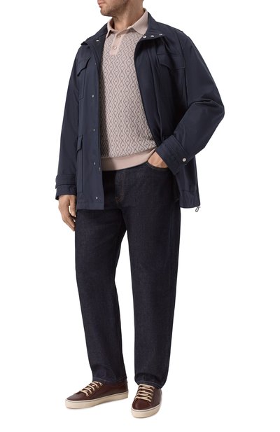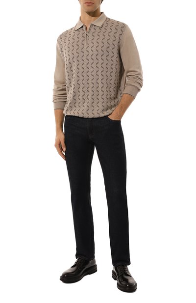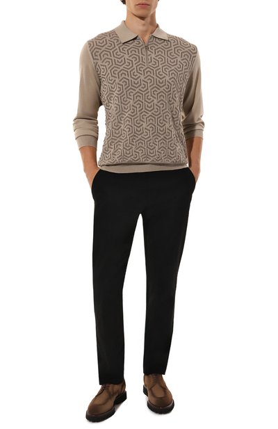 Для изготовления поло с жаккардовым графичным мотивом спереди использовали шерстяной трикотаж с добавлением шелка. Модель застегивается короткой молнией с пуллером в виде фирменного октагона.