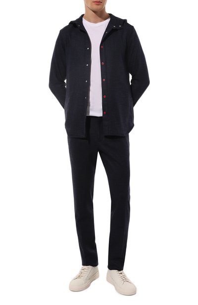 Брюки с эластичными вставками на поясе дополнили боковыми открытыми карманами и задними с клапанами. Модель с отглаженными стрелками сшили из костюмной шерсти.