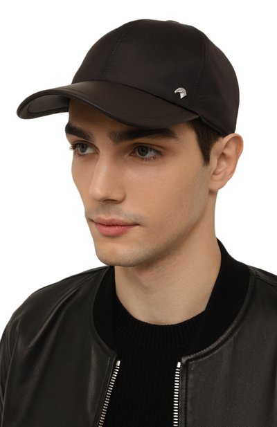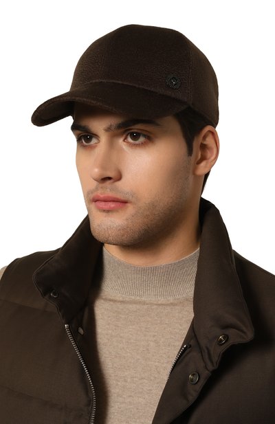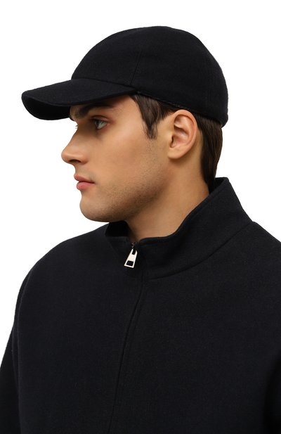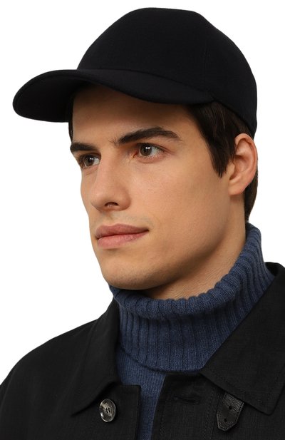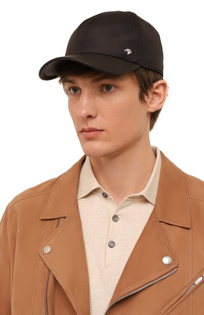 Бейсболку из чуть эластичного кашемира украсили логотипом, вышитым над козырьком нитью в тон. Посадка головного убора регулируется ремешком из кожи ягненка.