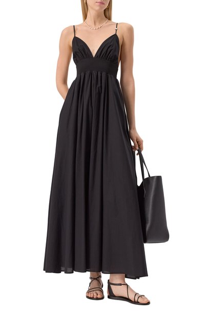 Для пошива платья-комбинации Renzo использовали полупрозрачный вискозный атлас. Перемычки на V-образных вырезах спереди и сзади, как и отделку по краям изделия, выполнили из кружева Sophie Hallette.
