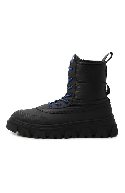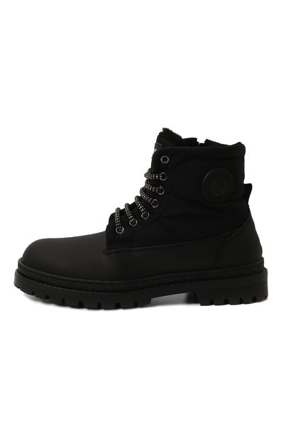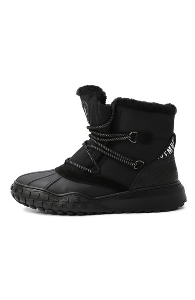 Ботинки с внутренней отделкой из пушистой овчины выполнили из полимерного материала, текстиля и замши. Голенище модели с усиленной шнуровкой украсили патчем с эмблемой и лентой с логотипом.