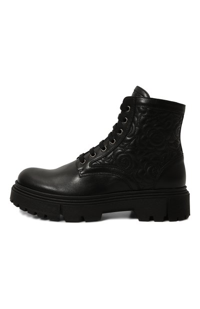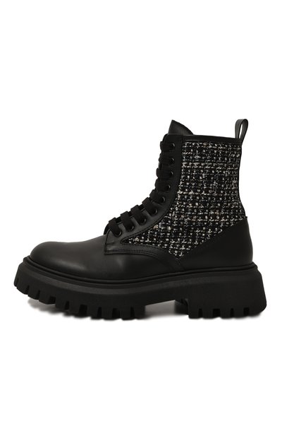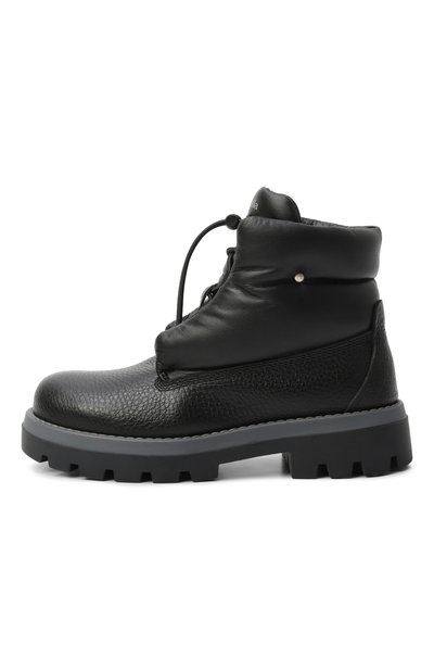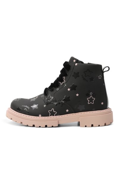 Высокие ботинки из экокожи с фирменным паттерном в виде звезд утеплили шерстью и кашемиром. Пару установили на контрастную подошву с протектором. Помимо бархатистой шнуровки предусмотрели боковую молнию.