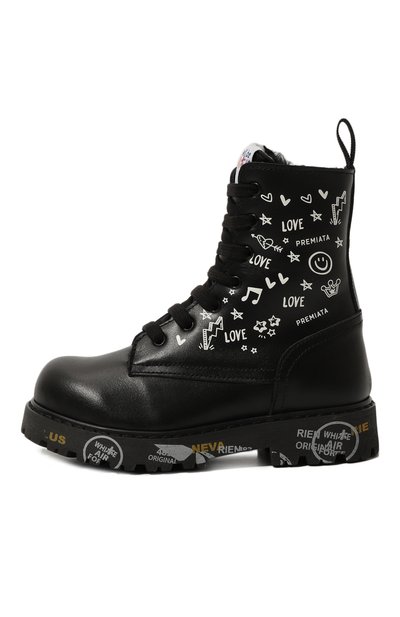 Высокие ботинки с брендированным паттерном в виде звезд изготовили из экокожи. Утепленную шерстью и кашемиром пару установили на широкую подошву с протектором. Помимо бархатистой шнуровки предусмотрели боковую молнию.