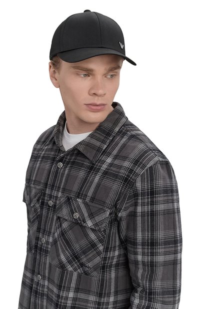 Для изготовления бейсболки с эластичным ремешком сзади использовали плотный нейлон. Над широким изогнутым козырьком аксессуар декорировали вышитым иероглифом-эмблемой.