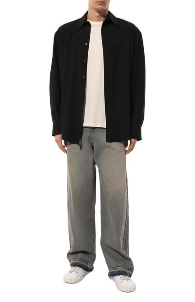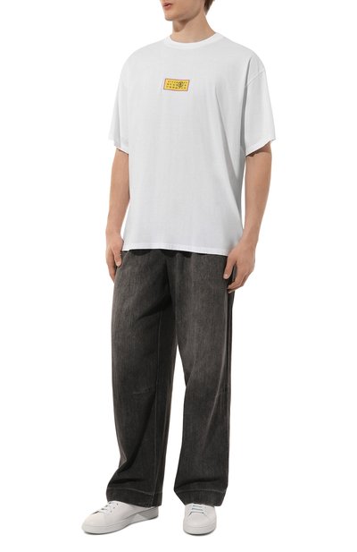 Для изготовления футболки свободного кроя использовали джерси из чистого хлопка. Спереди и на спинке модель с круглой горловиной декорировали брендированными принтами Moonlight.