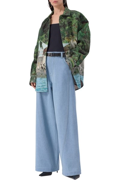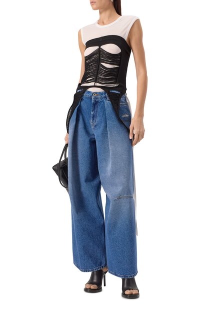 Джинсы с высокой посадкой и защипами сшили из хлопкового денима. Модель свободного кроя дополнили четырьмя врезными карманами и широким поясом со шлевками.
