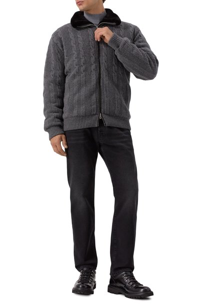 Ботинки с усиленной шнуровкой и текстильным подкладом сшили вручную из комбинации гладкой и зернистой кожи. Модель с рельефным швом на мысе установили на скульптурную протекторную подошву.