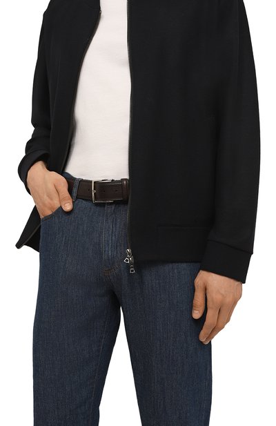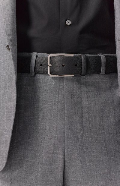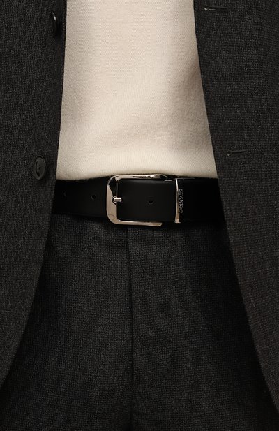 Ремень с фиксированной шлевкой выполнили из зернистой кожи. Аксессуар регулируется по длине металлической пряжкой с выгравированным логотипом сбоку.