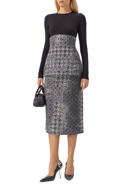 Джинсовую миди-юбку De-Rathian выполнили из хлопкового денима с двойным узором: верхний мотив пье-де-пуль частично выжгли лазером, чтобы показать виндзорскую клетку. Спереди модель с высокой шлицей и боковой молнией украсили металлической эмблемой Oval D.