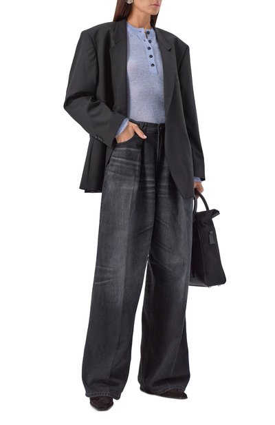 Широкие расклешенные джинсы 1996 D-Sire с пятью карманами выполнили из денима с добавлением конопляных волокон. Модель с необработанными неровными краями брючин выбелили лазером и постирали с искусственными камнями и энзимами, придав ей состаренный вид.