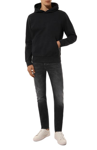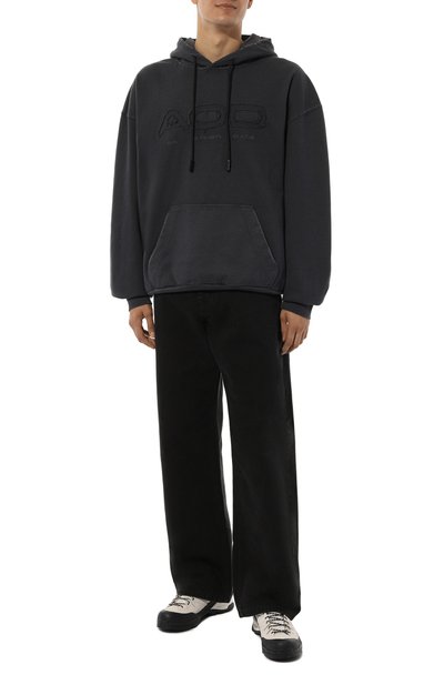 Окрашенное в готовом виде худи S-boxt-hood-t4 украсили нанесенным лазером логотипом на поясе в рубчик и алым брендированным прямоугольником на груди. Oversize-модель со спущенной линией плеч изготовили из хлопка.