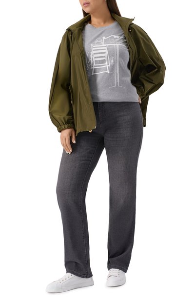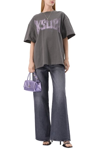 Приталенную футболку сшили из хлопкового джерси с абстрактным принтом. Края подчеркнули неоновым кантом. Спереди модель с круглым вырезом украсили логотипом марки.