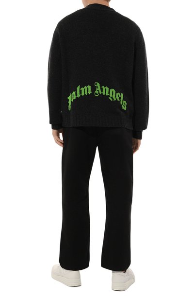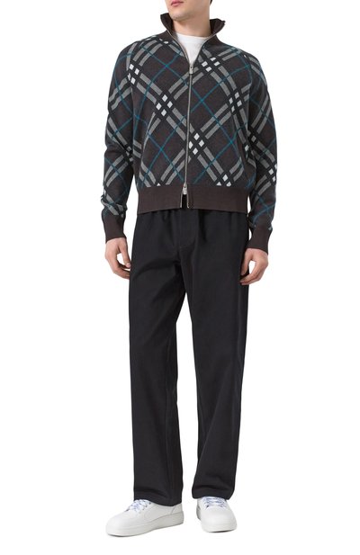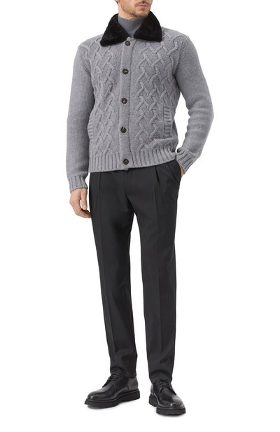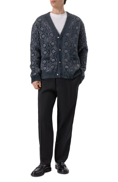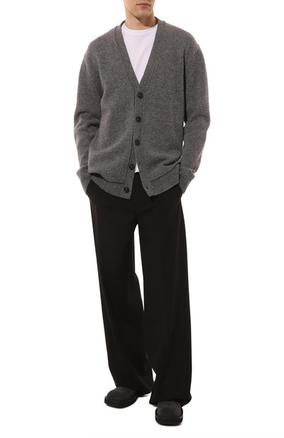 Кардиган с декоративными потертостями изготовили в технике деворе из смеси хлопка и полиамида. Горловину, пуговичную планку, манжеты и пояс изделия выполнили в рубчик.