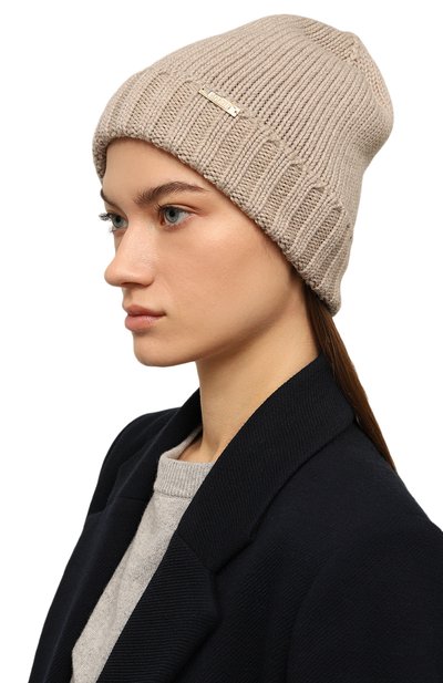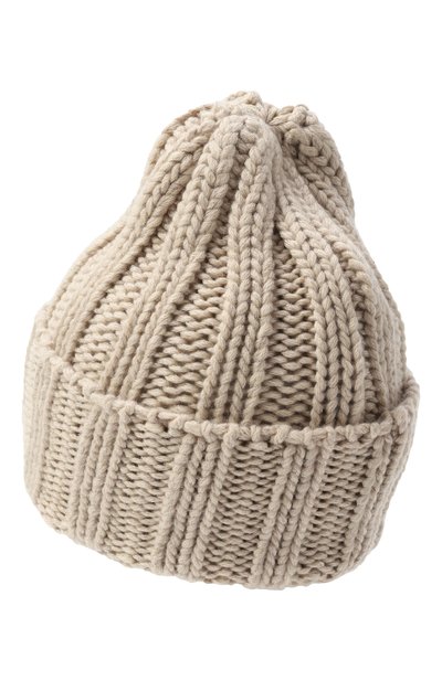 Шапку бини с рифленым узором связали из кашемировой пряжи с добавлением вискозы и полиэстера. Широкий отворот аксессуара дополнительно защищает от холода и ветра.