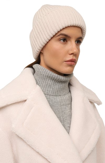 Для создания шапки использовали кашемирово-вискозную пряжку, которой добавили блеска полиэстеровой нитью. Бини эластичной вязки дополнили широким отворотом.