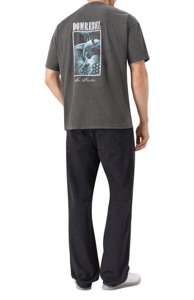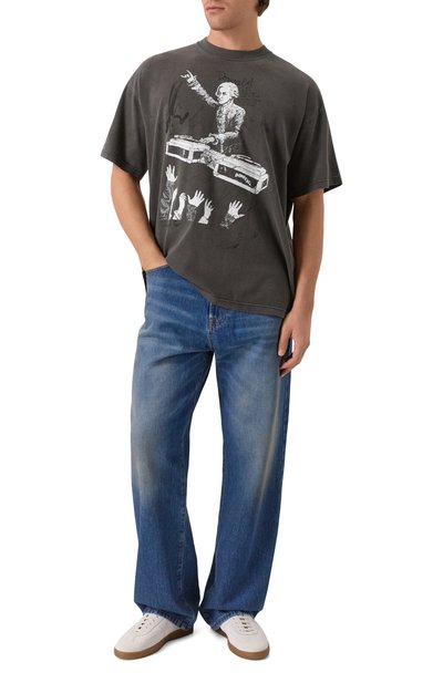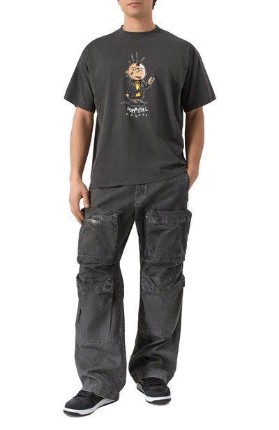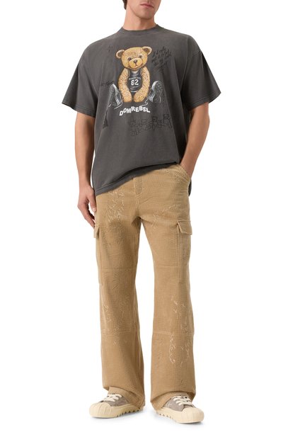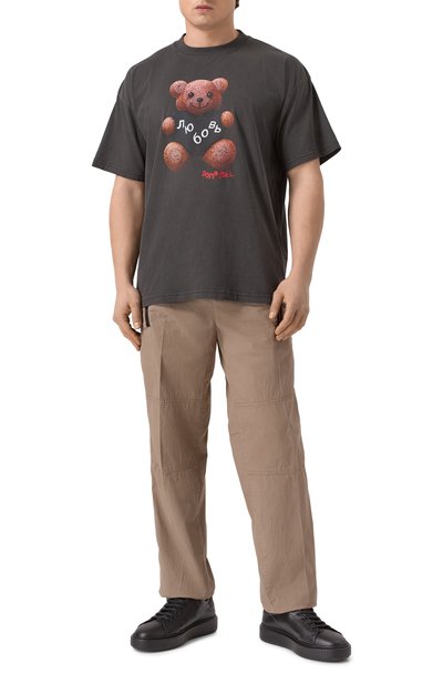 Представленную эксклюзивно в ЦУМе футболку выполнили из хлопкового трикотажа. Свободную модель с заплатками в тон украсили принтом Diablo Bear, который нанесли вручную в технике трафаретной печати.