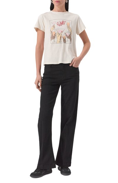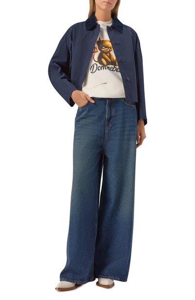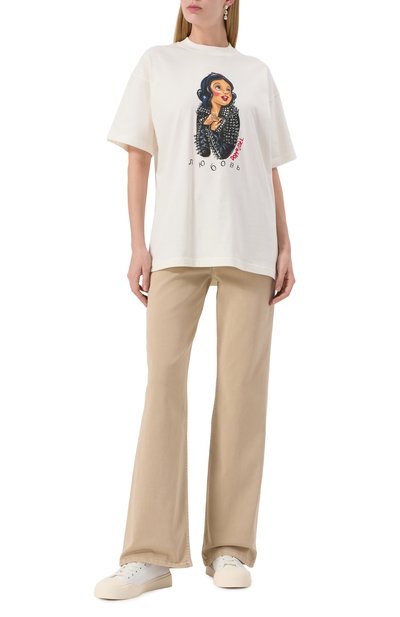 Футболку с имитацией заплат выполнили из хлопкового джерси. Спереди и сзади изделие украсили брендированными принтами с надписью Don't call me baby. Модель представлена эксклюзивно в ЦУМе.