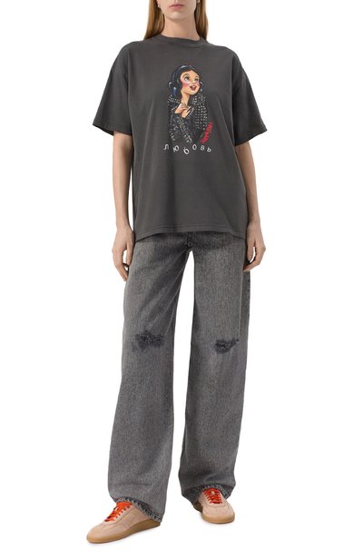 Футболку свободного кроя выполнили из хлопкового джерси. Выбеленную модель с рисунками, словно сделанными от руки, декорировали трафаретными принтами и надписями.