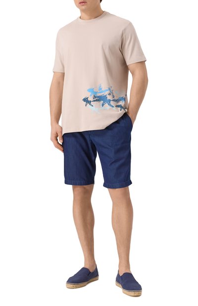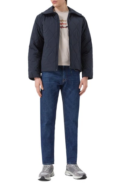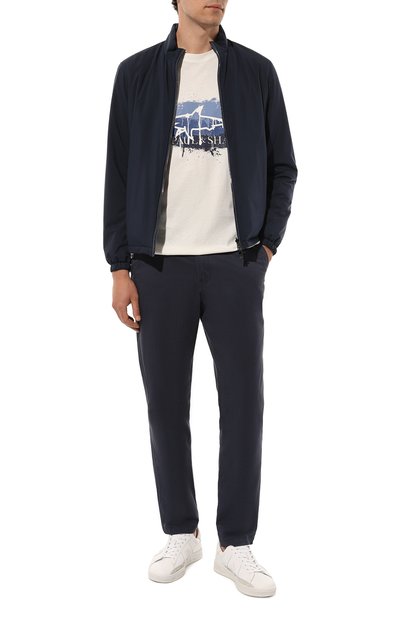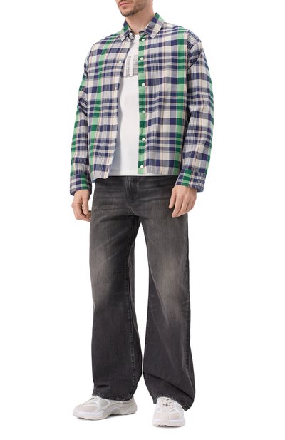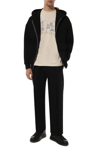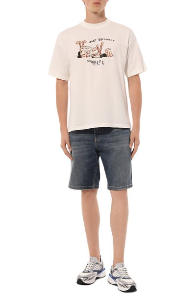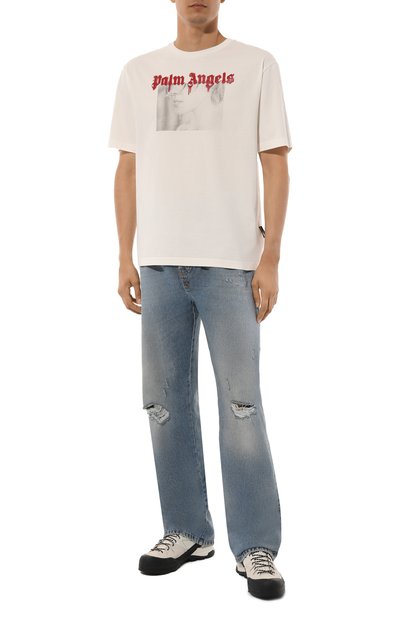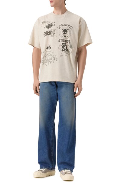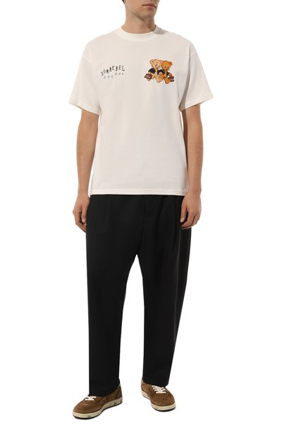 Футболку High Low из хлопкового трикотажа дополнили неглубокой круглой горловиной в рубчик. На принадлежность свободной модели бренду указали фирменными принтами, которые нанесли вручную в технике трафаретной печати.