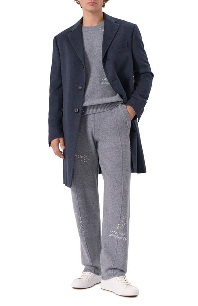 Брюки с прошитыми стрелками и поясом-кулиской в рубчик дополнили боковыми и задним накладным карманами. Модель из полушерстяного трикотажа с добавлением нейлона украсили вышитыми вручную стежками и логотипом.