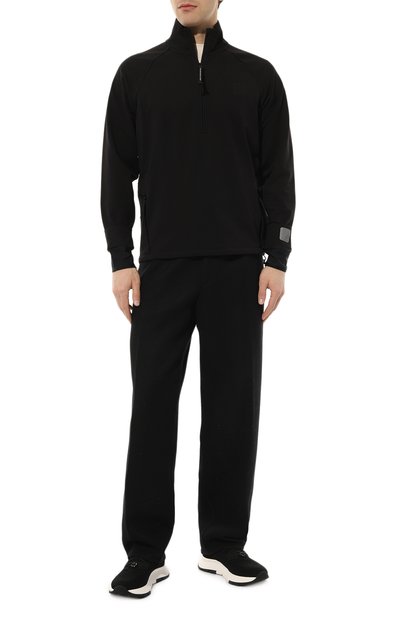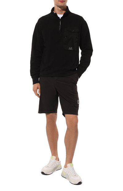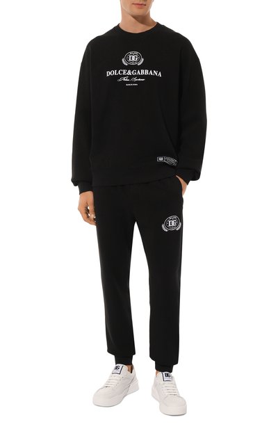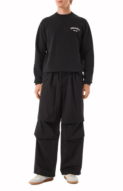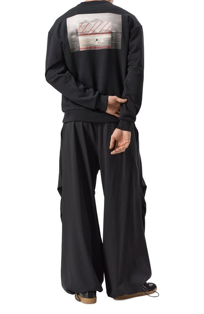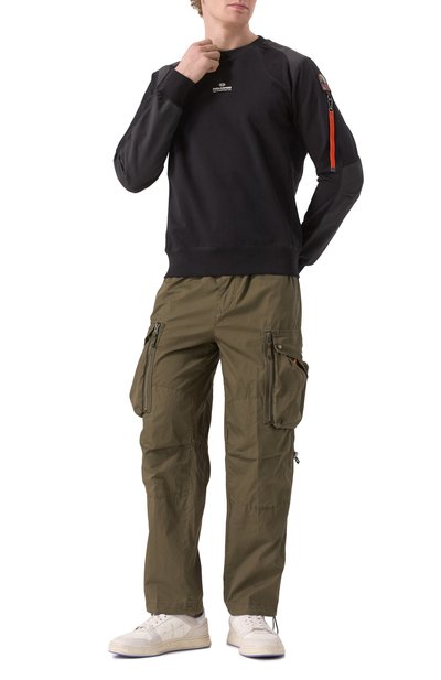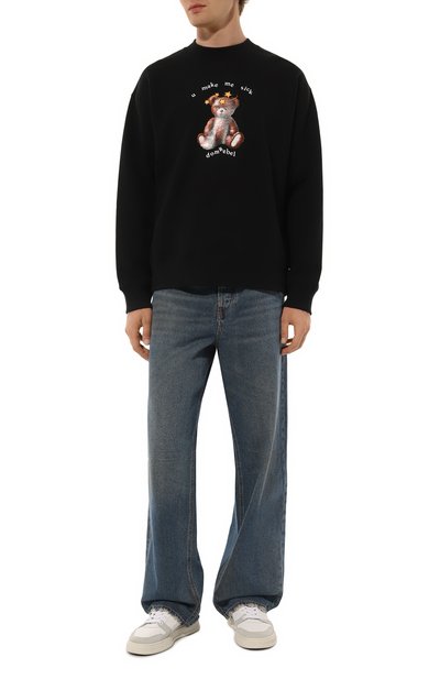 Свитшот свободного кроя выполнили из хлопкового трикотажа с фактурной изнанкой. Модель с брендированными надписями спереди и на спинке декорировали брызгами краски и необработанными патчами, имитирующими заплаты.