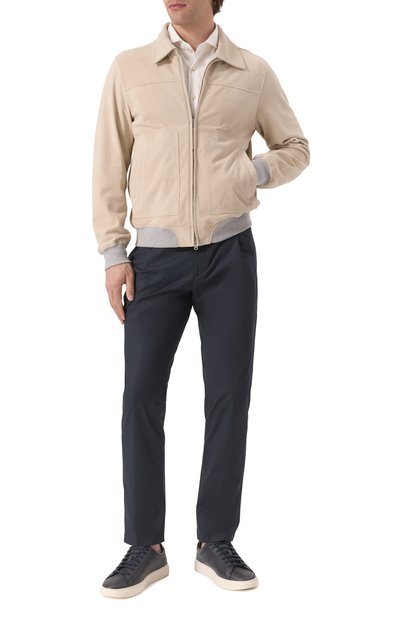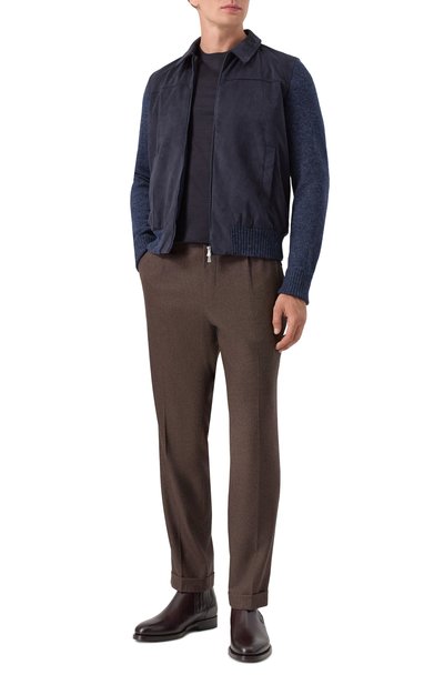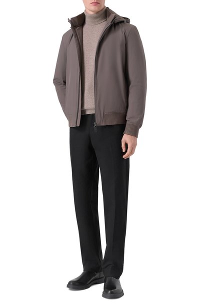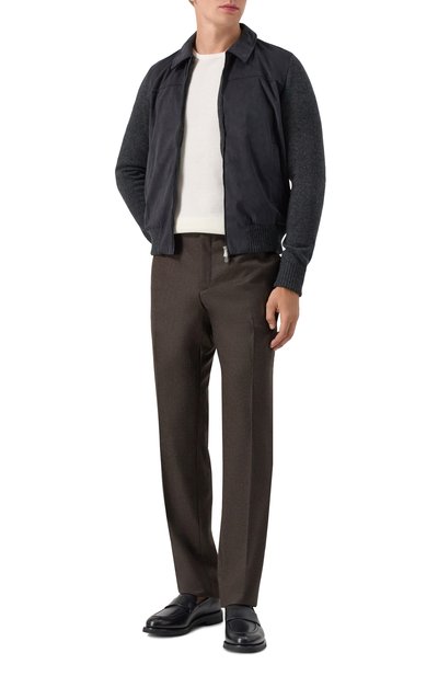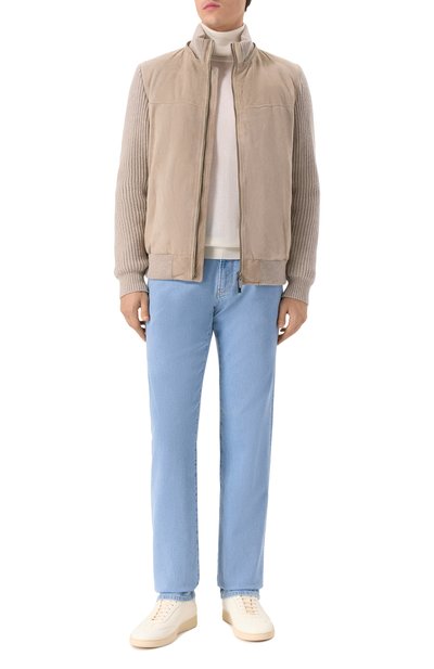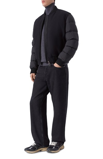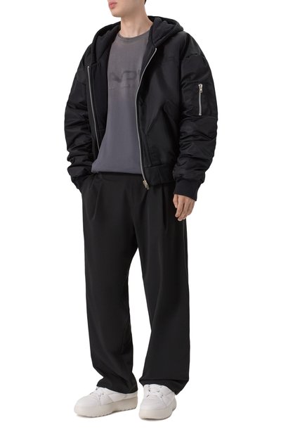 Бомбер Megalo с манжетами и поясом в рубчик и отложным воротником выполнили из плотной ткани с принтами и надписями, напоминающими рисунки от руки. Куртку на кнопках дополнили боковыми и внутренним карманами.