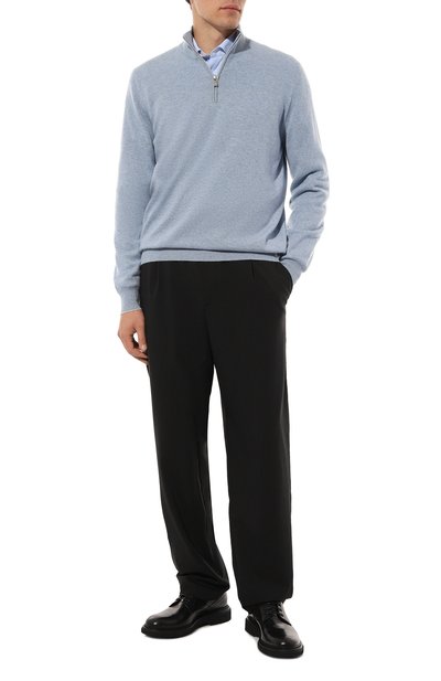 Приталенный джемпер выполнен из кашемирового трикотажа. Изделие с высоким воротником, манжетами и поясом в рубчик застегивается брендированными пуговицами.