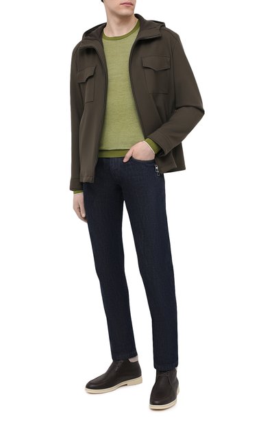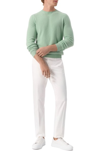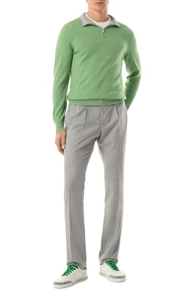 Для изготовления джемпера использовали пряжу из чистого кашемира. Модель с высоким воротом, манжетами и поясом в рубчик дополнили спереди короткой планкой с брендированными перламутровыми пуговицами.