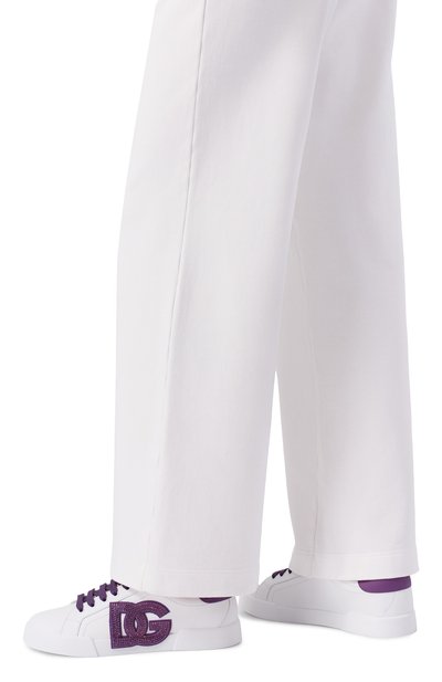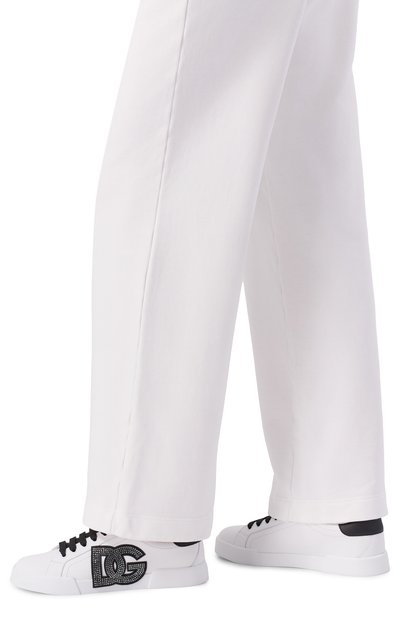 Кеды Portofino на широкой подошве из полимера EVA сшили из телячьей кожи, полученной от сертифицированных кожевенных заводов. Модель с контрастным задником украсили логотипом на язычке и эмблемой DG со стразами сбоку.
