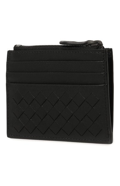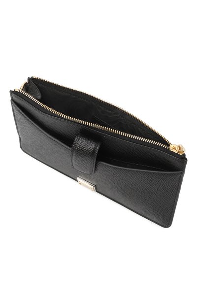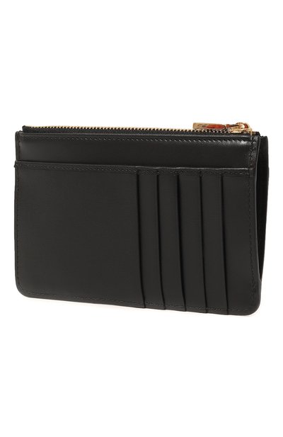 Футляр из лакированной кожи с тиснением под ящерицу декорировали фирменной двухслойной пластиной. Помимо шести карточных слотов предусмотрели два отсека для купюр и чеков, а также центральный монетный карман на молнии.