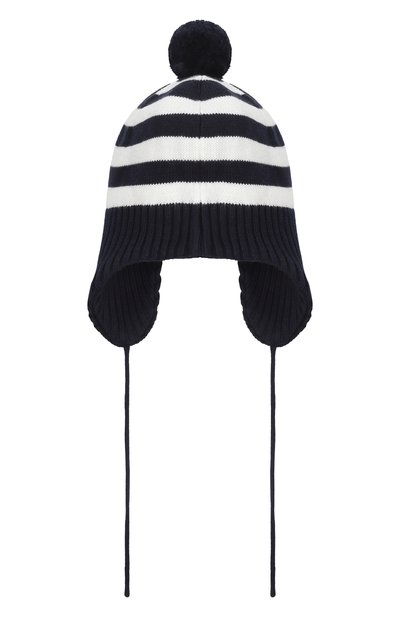Двухслойную шапку с наушниками, дополненными длинными завязками, связали рифленым узором из шерстяной пряжи. Модель украсили текстильным помпоном и брендированной пластиной.