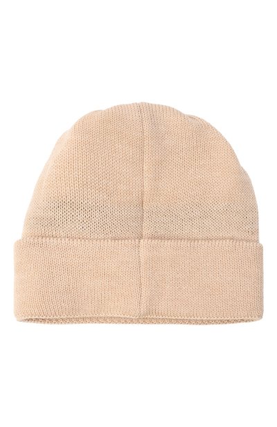 Шапку с помпоном из меха песца выполнили из шерстяной пряжи. Широкий отворот покрытого стразами аксессуара украсили бархатным бантом с брендированной подвеской.