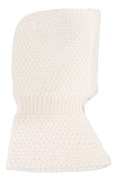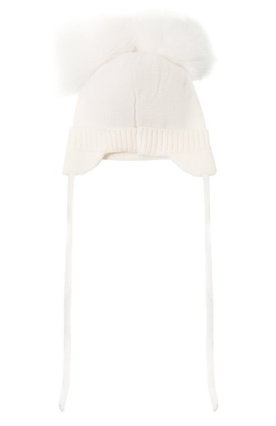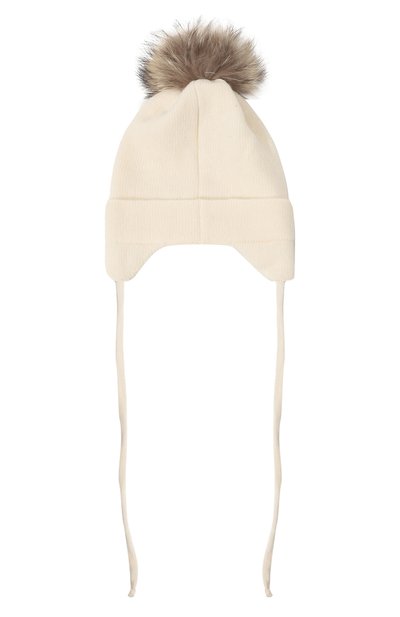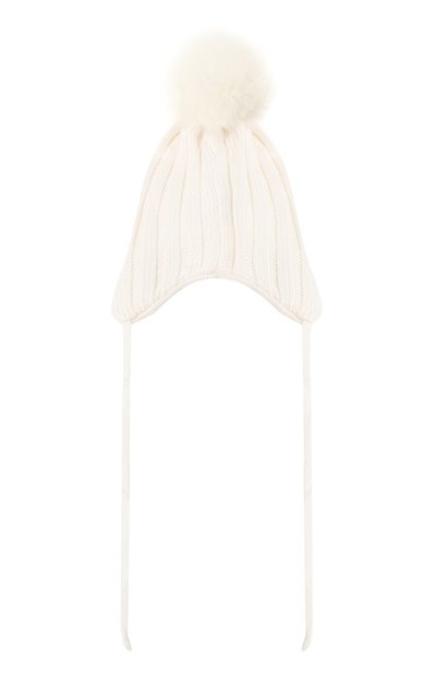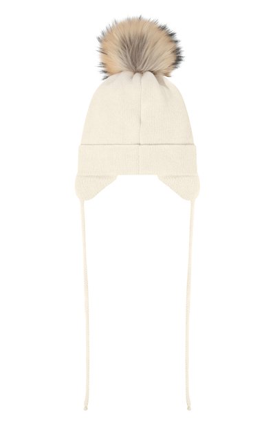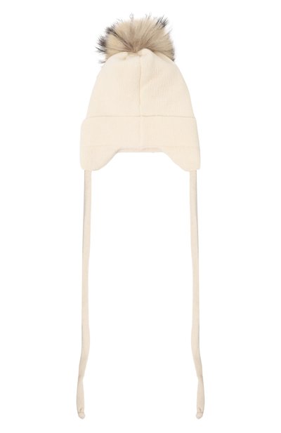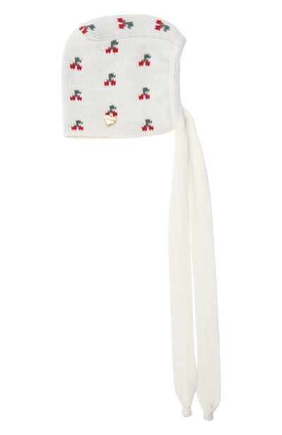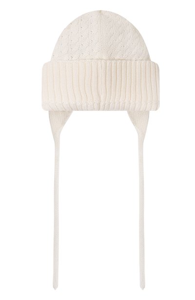 Двухслойную шапку выполнили из шерстяной пряжи, сформировав ягодный узор. Однотонные наушники аксессуара, украшенного фирменной подвеской сбоку, дополнили длинными завязками.