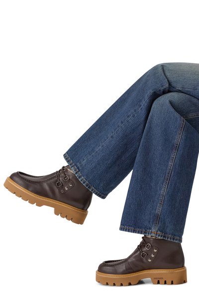 Ботинки с внутренней отделкой из овчины выполнили из замши. Задник модели на резиновой подошве украсили накладкой в виде фирменной эмблемы.
