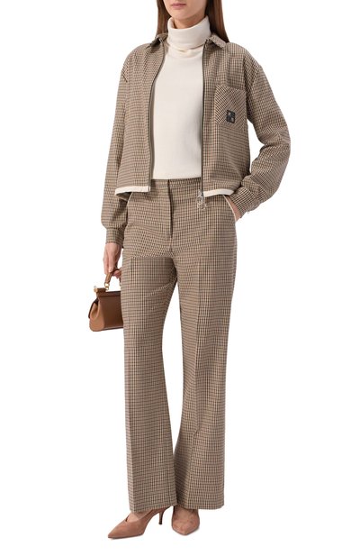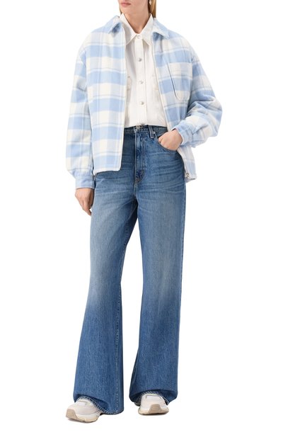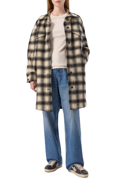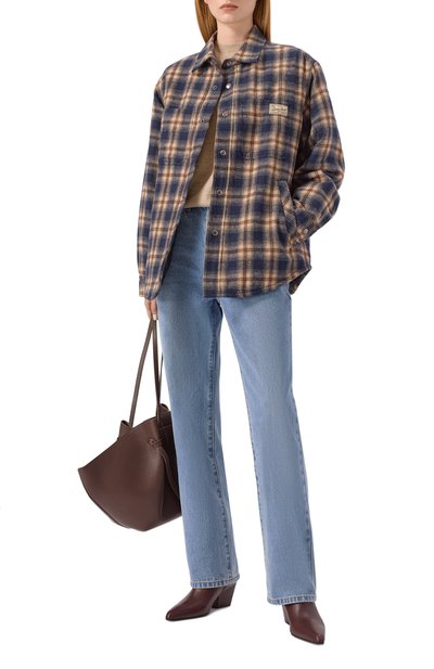 Клетчатую куртку-рубашку с тонким синтетическим утеплителем выполнили из смесовой ткани с добавлением хлопка и шерсти. Модель на кнопках дополнили накладными нагрудными карманами с брендированным патчем на одном из них.