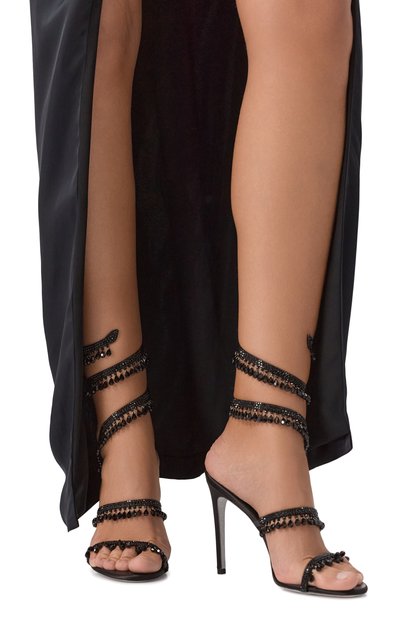 Босоножки Chandelier на подошве Stardust выполнили из атласа и кожи, установив модель на высокий каблук. Пару с витым ремешком украсили стразами и бахромой из бусин.