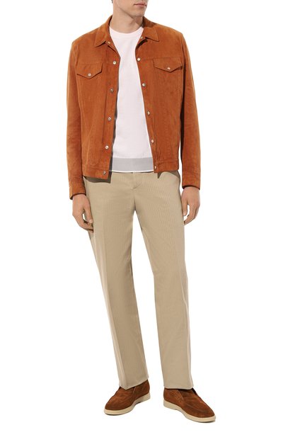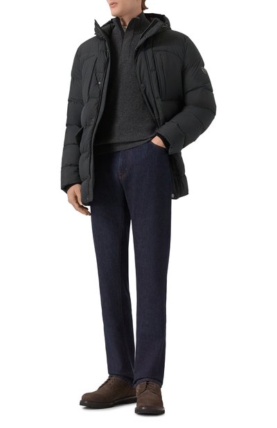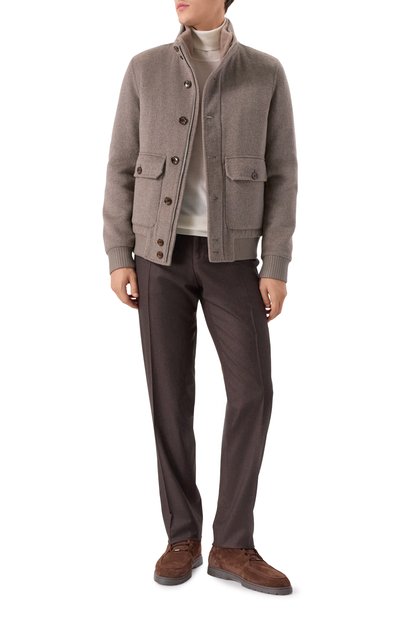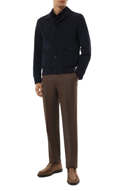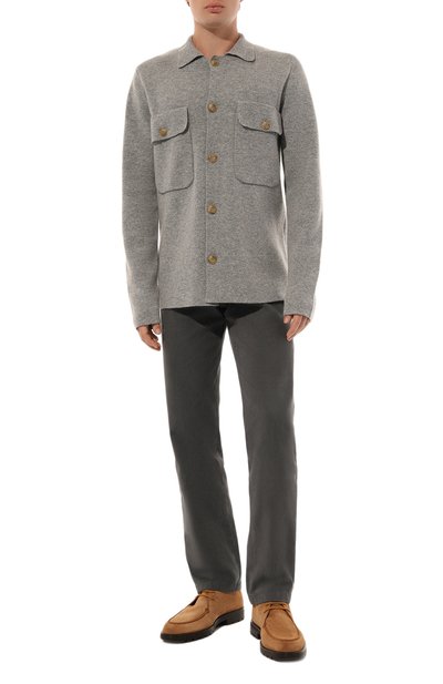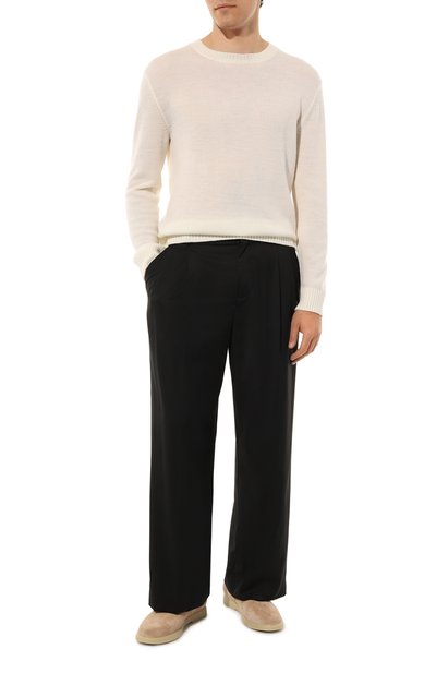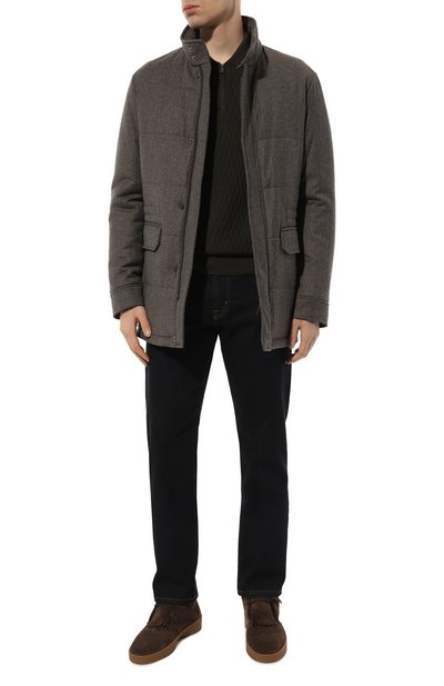 Дезерты с внутренней отделкой из овчины выполнили из бархатистой телячьей замши. Ботинки на гибкой протекторной подошве декорировали брендированной накладкой на шнуровке и фирменными резиновыми шипами на заднике.