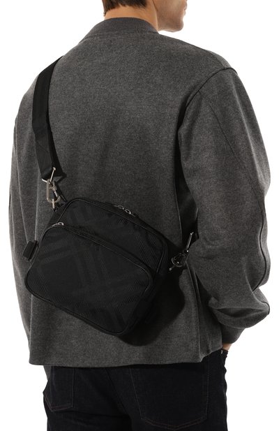 Сумку Slim Grid в фирменную клетку Burberry Check выполнили из полиамида и полиуретана. Спереди изделие с регулируемым плечевым ремнем украсили накладкой со знаковой эмблемой Equestrian Knight Design. Сама модель закрывается молнией, а внешний карман — магнитной застежкой.