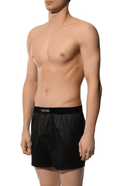 Боксеры выполнили из стрейчевого шелкового атласа с геометрическим микроузором. Трусы дополнили широким поясом-резинкой с брендированным патчем спереди.