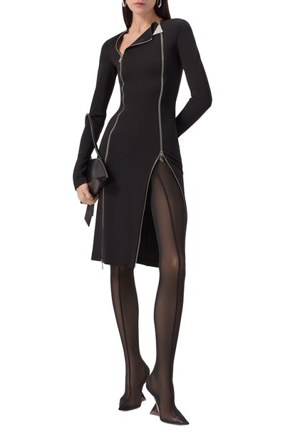 Мини-платье Black star с высоким воротником и асимметричным подолом сшили из эластичного полиамида. Модель с вырезом в форме звезды застегивается потайной молнией сзади.