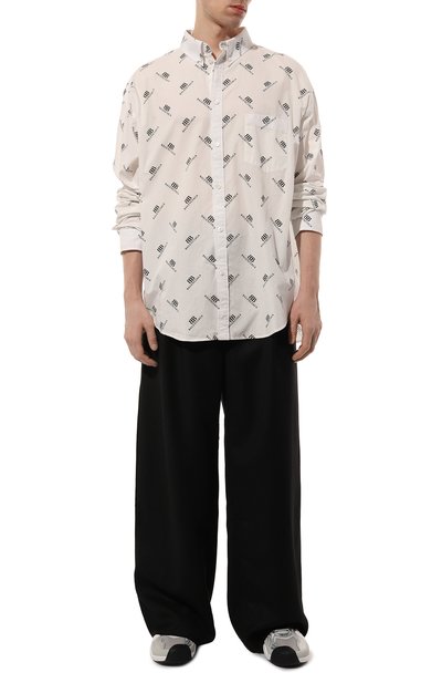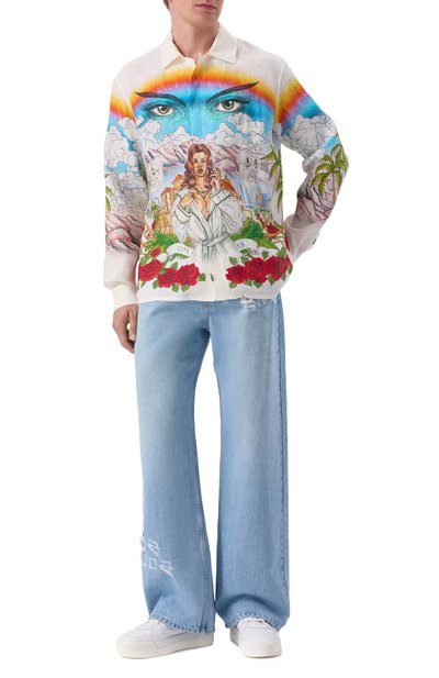 Рубашку со спущенной линии плеч, фигурным низом и закругленными манжетами выполнили из полосатого хлопкового поплина с принтом Majolica. Чтобы добиться абсолютной симметрии, мотив наносили вручную на уже раскроенные детали.