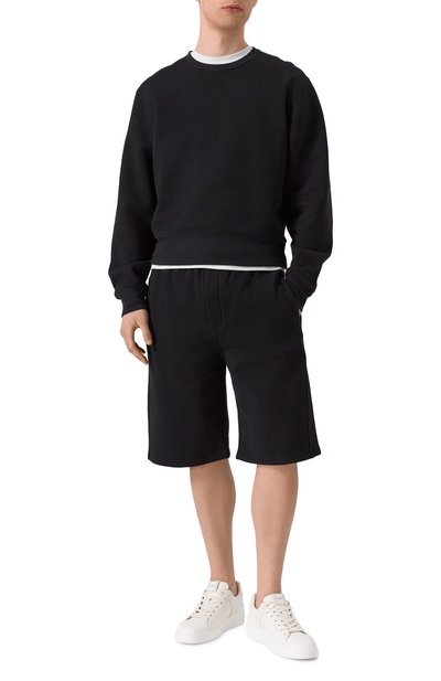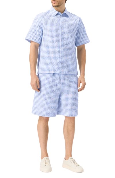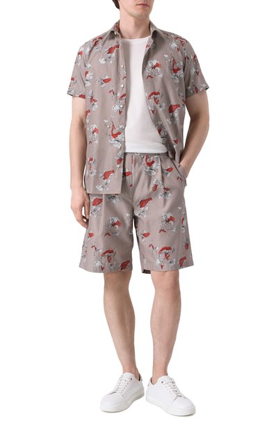 Свободные шорты выполнили из хлопкового поплина с принтом Majolica. Модель с эластичным поясом-кулиской дополнили двумя карманами по бокам и еще одним сзади на пуговице.