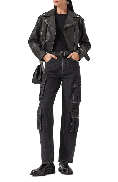 Куртку из зернистой кожи с деликатным блеском дополнили четырьмя карманами с клапанами. Линию плеч подчеркнули погонами, а спинку декорировали фирменной двухслойной пластиной. Модель с шелковым подкладом и регулируемыми патами на поясе застегивается молнией, скрытой под штормовой планкой на кнопках.