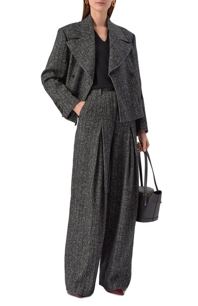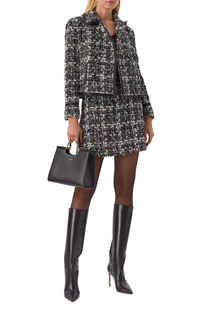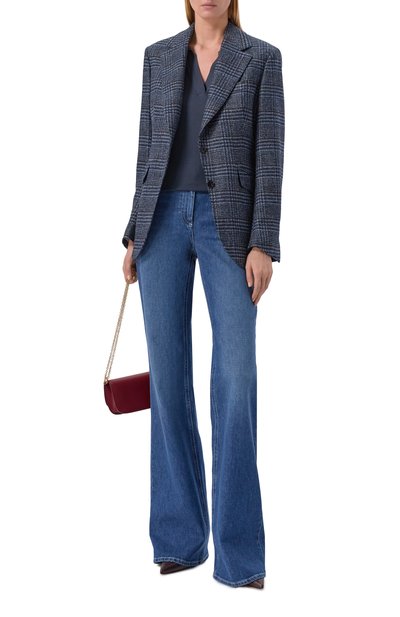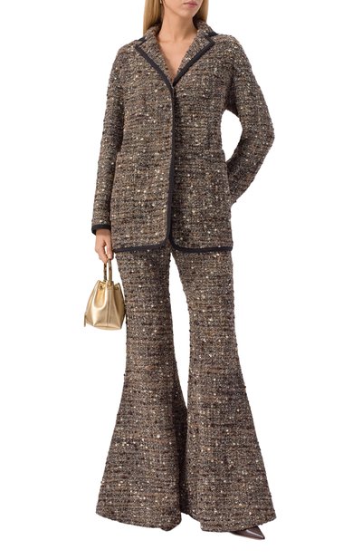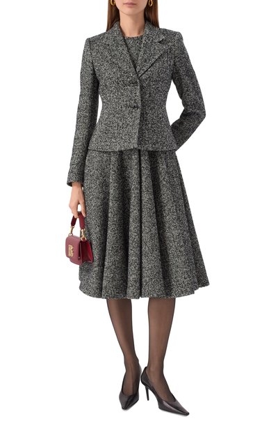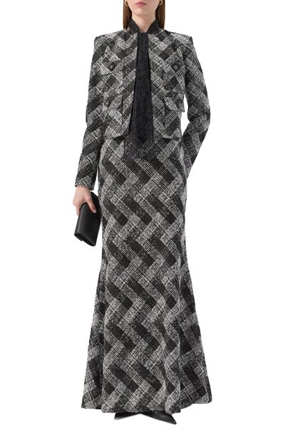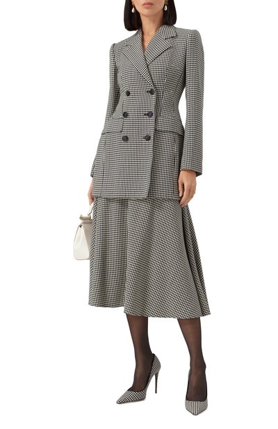 Жакет в крупную клетку изготовили из твида на основе шерсти и шелка. Приталенная модель с прямоугольными лацканами и боковыми карманами составит гармоничный дуэт с парной юбкой.