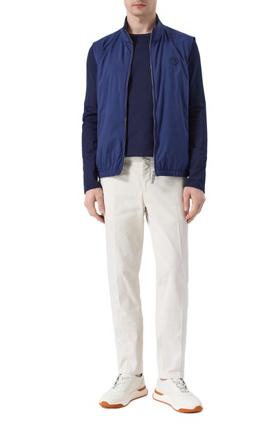 Жилет из хлопкового денима с декоративными потертостями украсили фирменной двухслойной пластиной на спинке. Модель с регулируемыми патами на поясе дополнили боковыми карманами с листочками и нагрудными с клапанами.